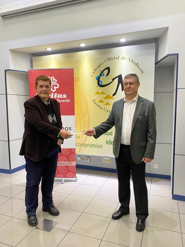 El Presidente del COMTF, Dr. Rodrigo Martín hace entrega al Director de Cáritas Tenerife, Sr Juan Rognoni del cheque nominativo de los fondos recaudados.
