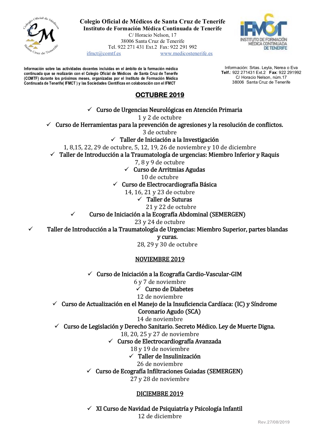 Programación de cursos y talleres del Instituto de Formación Médica Continuada de Tenerife para el próximo semestre.